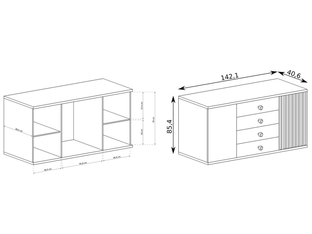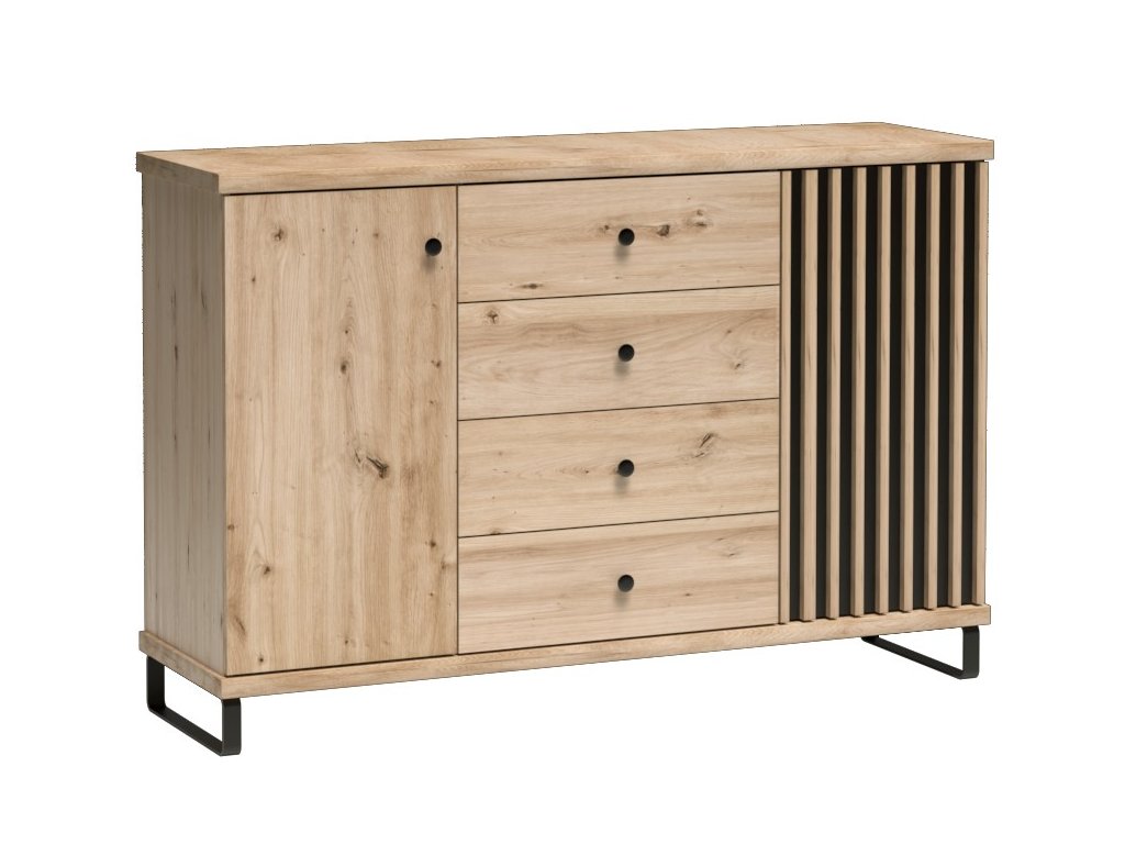 Komoda dvoudveřová se čtyřmi zásuvkami s netradičním provedením detailu dvířek s lamelami. Kolekce nábytku v sobě spojuje jednoduchost, originální vzhled a funkčnost. Barevné provedení je v kombinaci dub artisan/černá mat. Nábytek je vyroben z kvalitního lamina ohraničeného ABS páskou, dekorační lamely jsou vyrobeny z desky MDF. Zásuvky jsou vybaveny kovovými pojezdy se systémem tichého dovírání. Kolekce se skládá z mnoha prvků a tento široký výběr Vám zaručí sestavit si nábytek podle svých vlastních představ a přání. Dodáváme v demontovaném stavu.Doplňkové parametry