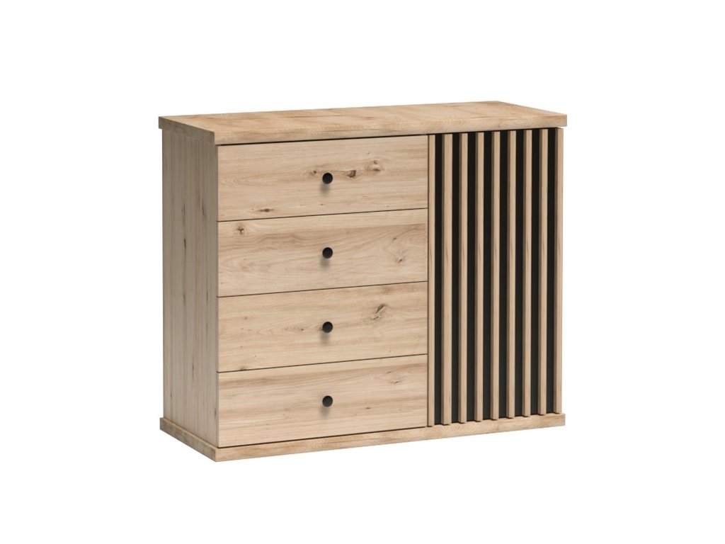 Komoda jednodveřová se čtyřmi zásuvkami s netradičním provedením detailu dvířek s lamelami. Kolekce nábytku v sobě spojuje jednoduchost, originální vzhled a funkčnost. Barevné provedení je v kombinaci dub artisan/černá mat. Nábytek je vyroben z kvalitního lamina ohraničeného ABS páskou, dekorační lamely jsou vyrobeny z desky MDF. Zásuvky jsou vybaveny kovovými pojezdy se systémem tichého dovírání. Komoda je doplněna kovovými nohami v černé barvě. Kolekce se skládá z mnoha prvků a tento široký výběr Vám zaručí sestavit si nábytek podle svých vlastních představ a přání. Dodáváme v demontovaném stavu.Doplňkové parametry