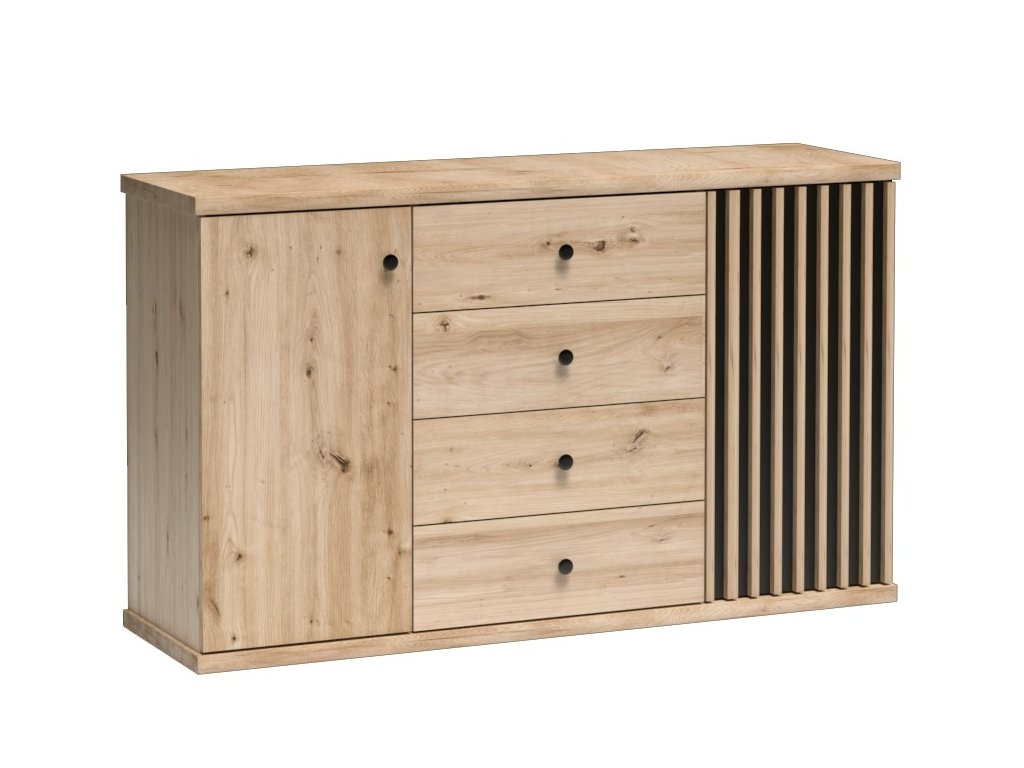 Komoda dvoudveřová se čtyřmi zásuvkami s netradičním provedením detailu dvířek s lamelami. Kolekce nábytku v sobě spojuje jednoduchost, originální vzhled a funkčnost. Barevné provedení je v kombinaci dub artisan/černá mat. Nábytek je vyroben z kvalitního lamina ohraničeného ABS páskou, dekorační lamely jsou vyrobeny z desky MDF. Zásuvky jsou vybaveny kovovými pojezdy se systémem tichého dovírání. Komoda je doplněna kovovými nohami v černé barvě. Kolekce se skládá z mnoha prvků a tento široký výběr Vám zaručí sestavit si nábytek podle svých vlastních představ a přání. Dodáváme v demontovaném stavu.Doplňkové parametry