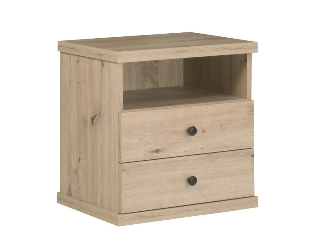 Noční stolek se dvěma zásuvkami. Kolekce nábytku v sobě spojuje jednoduchost, originální vzhled a funkčnost. Barevné provedení je v kombinaci dub artisan. Nábytek je vyroben z kvalitního lamina ohraničeného ABS páskou. Úchyty jsou v barvě černé. Kolekce se skládá z mnoha prvků a tento široký výběr Vám zaručí sestavit si nábytek podle svých vlastních představ a přání. Dodáváme v demontovaném stavu.Doplňkové parametry