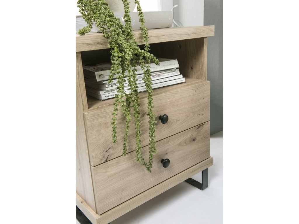 Noční stolek se dvěma zásuvkami. Kolekce nábytku v sobě spojuje jednoduchost, originální vzhled a funkčnost. Barevné provedení je dub artisan. Nábytek je vyroben z kvalitního lamina ohraničeného ABS páskou. Úchyty jsou v barvě černé. Noční stolek je doplněn kovovými nohami v černé barvě. Kolekce se skládá z mnoha prvků a tento široký výběr Vám zaručí sestavit si nábytek podle svých vlastních představ a přání. Dodáváme v demontovaném stavu.Doplňkové parametry