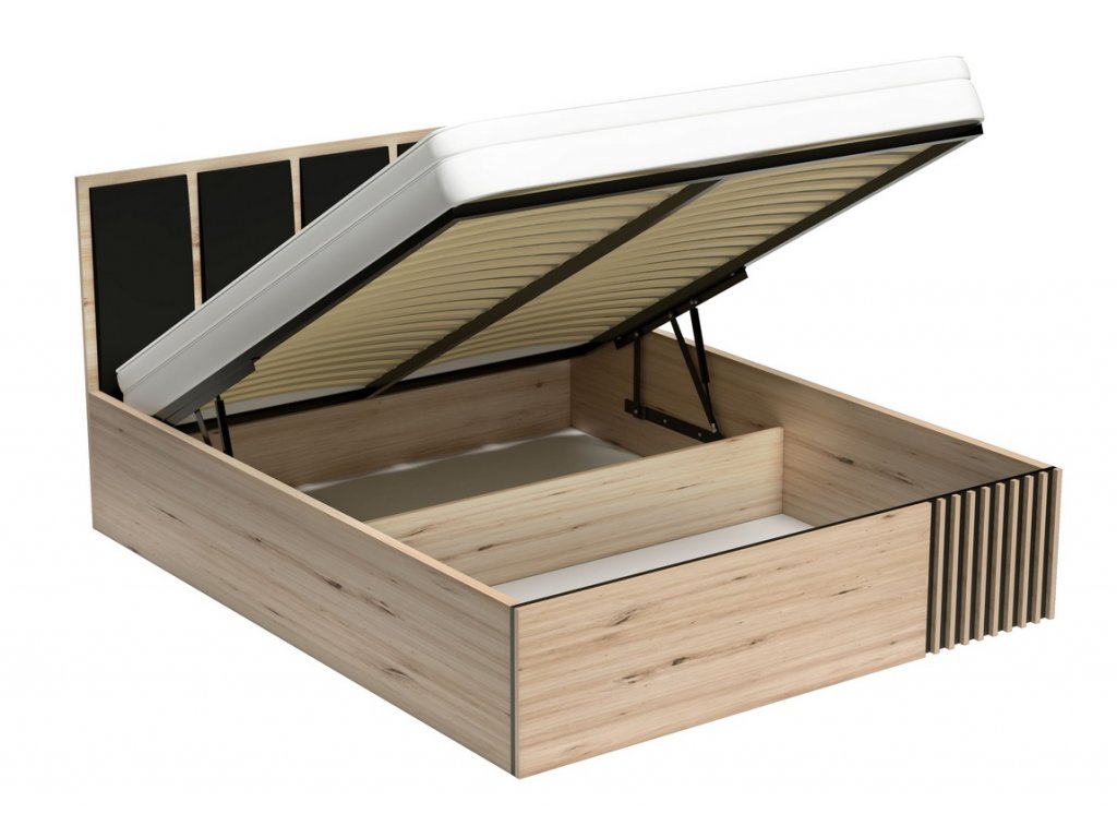 Sestava nábytku do ložnice v moderním provedení. Kolekce nábytku v sobě spojuje jednoduchost, originální vzhled a funkčnost. Barevné provedení je v kombinaci dub artisan/černá mat. Nábytek je vyroben z kvalitního lamina ohraničeného ABS páskou, dekorační lamely jsou vyrobeny z desky MDF. Sestava se skládá z těchto položek (Š x V x H cm) - šatní skříň s posuvnými dveřmi (179 x 216 x 60 cm), manželská postel se zvedacím roštem a úložným prostorem (167,3 x 100 x 207 cm) a 2x noční stolek s nožkama (48 x 61 x 40,6 cm). Čelo postele je doplněno polstrováním. Postel je bez matrace, tu je nutno dokoupit. Doporučený rozměr matrace je 160 x 200 cm nebo 2 ks 80 x 200 cm. Kolekce se skládá z mnoha prvků a tento široký výběr Vám zaručí sestavit si nábytek podle svých vlastních představ a přání. Dodáváme v demontovaném stavu.Doplňkové parametry