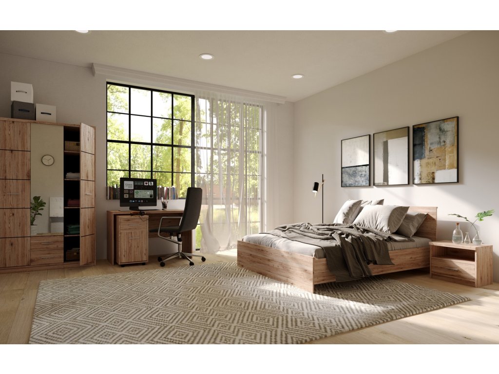 Ložnicová sestava je vyrobena z kvalitního LTD v barvě dub san remo světlý s výraznou kresbou dřeva. Kolekce je navržena v minimalistickém stylu as radostí si vychutnáte zvláštní kouzlo a pohodlí takto vytvořeného nábytku. Sestava obsahuje: šatní skříň 3-dveřová se 2 zásuvkami - (š/v/h) 119/199/54 cm, postel + rošt - (š/v/h) 164/85/205 cm; výška sezení 37 cm a 2 ks noční stolek s 1 zásuvkou - (š/v/h) 53/44/35 cm. Matraci je třeba doobjednat, vhodný rozměr 160 x 200 cm. Jednotlivé díly lze zakoupit zvlášť. Dodáváme v demontovaném stavu.Doplňkové parametry