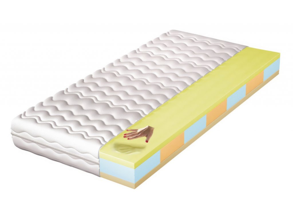 Pěnová matrace 120x200 cm v pratelném snímatelném potahu. Skládá se ze tří vrstev - střed tvoří 10 cm sedmizónová PUR pěna T25, která je z jedné strany potažena 3 cm silnou termoelastickou pěnou a z druhé strany 3 cm silnou vysoce elastickou pěnou, což umožňuje výběr užitkové strany vzhledem k rozdílům ve vlastnostech pěn. Termoelastická pěna (visco) při kontaktu s tělesným teplem měkne, nevytváří protitlak a pružně se přizpůsobí anatomii lidského těla. Díky tzv. efektu pomalého vracení (líná pěna) rovnoměrně rozkládá tlak matrace na lidské tělo, což má pozitivní vliv na krevní oběh, zlepšuje kvalitu spánku a zmírňuje bolesti zad.