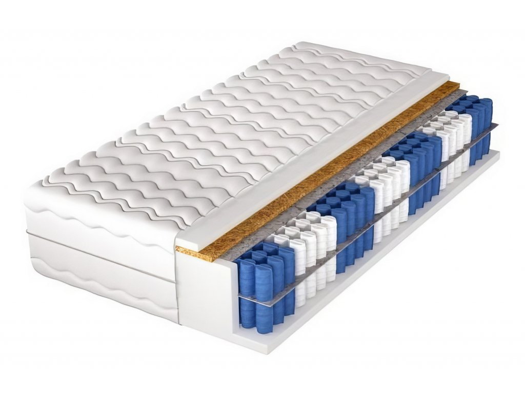 Pružinová matrace 120x200 cm v pratelném snímatelném potahu. Jádro matrace je charakteristické dvojitými hustě uspořádanými taštičkovými pružinami v množství 262 ks/m2 a 7 zónami tvrdosti, které zajišťují dokonalou oporu těla a komfort odpočinku. Za zmínku stojí funkce taštičkových pružin, které pracují odděleně a reagují jen v místě tlaku. Pokud si tedy na matraci lehnete, dojde ke stlačení pouze těch pružin, na které se vyvíjí tlak. Matrace je z jedné strany potažena 1 cm silnou kokosovou deskou a PUR pěnou T25 o síle 2 cm a z druhé strany 2 cm vrstvou PUR pěny T25, což umožňuje výběr užitkové strany vzhledem k rozdílům ve vlastnostech materiálů. Kokos se v matracích používá ke zpevnění, zvýšení nosnosti a odolnosti, zároveň je antibakteriální a antialergický. Pomáhá odvádět vlhkost z matrace a udržuje uvnitř suché prostředí. Matrace je hypoalergenní a použití bavlny v potahu matrace podporuje cirkulaci vzduchu a poskytuje dobrou tepelnou izolaci. Je odolná vůči různým druhům tlaku, deformaci a promáčknutí a poskytuje dobrou ventilaci, což ocení lidé s nadměrným pocením. Matrace má označení tvrdosti H3/H5 - středně tvrdá/extra tvrdá. Výška matrace je +/- 30 cm. Barva pěn se může lišit od vyobrazení.