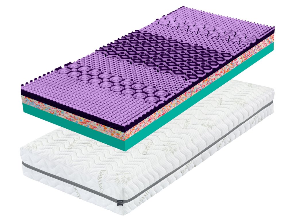 Tuhá zdravotní sendvičová matrace z pružných pěn Flexifoam s 3 D Rainbow technogií a zvýšenou výškou na 22 cm. Součástí je dvojdílný antialergický potah Bamboo, pratelný na 60 °C. Výtažky vláken bambusu pomáhají vytvářet přirozené prostředí pro omezení vzniku roztočů a zamezení šíření alergenů. Výtažky z vláken bambusu navíc dobře pohlcují vlhkost. Strana „relax“ (strana HARD) s 3D Rainbow technologií je velmi příjemná, komfortní a vysoce účinná. Je o něco tužší než strana „klasik“ a nabízí 7 anatomických zón s jemným masážním účinkem pro uvolnění napjatého svalstva a podporu správného krevního oběhu v průběhu spánku, což je u tuhé matrace obzvláště důležité. Robustní, tuhý a odolný střed z eko pěny Flexifoam RekoNatura šetří přírodu i Vaši peněženku. Strana „klasik“ (strana SOFT) je masivní vrstva neprofilované Flexifoam pěny, která vyniká vysokou pružností a prodyšností. Doporučená nosnost do 140 kg. Matrace je vhodná na pevný lamelový rošt na postel o rozměrech 160x200 cm.Doplňkové parametry