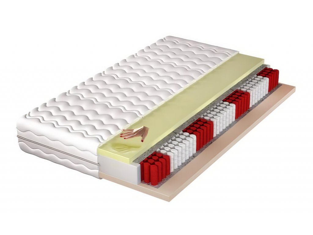 Pružinová matrace 80x200 cm v pratelném snímatelném potahu. Jádro matrace je charakteristické hustě uspořádanými taštičkovými pružinami v množství 506 ks/m2 a 7 zónami tvrdosti, které zajišťují dokonalou oporu těla a komfort odpočinku. Za zmínku stojí funkce taštičkových pružin, které pracují odděleně a reagují jen v místě tlaku. Pokud si tedy na matraci lehnete, dojde ke stlačení pouze těch pružin, na které se vyvíjí tlak. Matrace je z jedné strany potažena 3 cm silnou termoelastickou pěnou a z druhé strany 3 cm silnou vysoce elastickou pěnou, což umožňuje výběr užitkové strany vzhledem k rozdílům ve vlastnostech pěn. Termoelastická pěna (visco) při kontaktu s tělesným teplem měkne, nevytváří protitlak a pružně se přizpůsobí anatomii lidského těla. Díky tzv. efektu pomalého vracení (líná pěna) rovnoměrně rozkládá tlak matrace na lidské tělo, což má pozitivní vliv na krevní oběh, zlepšuje kvalitu spánku a zmírňuje bolesti zad. Druhým materiálem je pěna s vysokou elasticitou, která je podobná latexu, poskytuje dobrou oporu tělu, zvyšuje pohodlí, elasticitu a flexibilitu. Matrace je hypoalergenní a použití bavlny v potahu matrace podporuje cirkulaci vzduchu a poskytuje dobrou tepelnou izolaci. Je odolná vůči různým druhům tlaku, deformaci a promáčknutí a poskytuje dobrou ventilaci, což ocení lidé s nadměrným pocením. Obě strany matrace mají označení tvrdosti H4 - tvrdá. Výška matrace je +/- 20 cm. Barva pěn se může lišit od vyobrazení.Doplňkové parametry