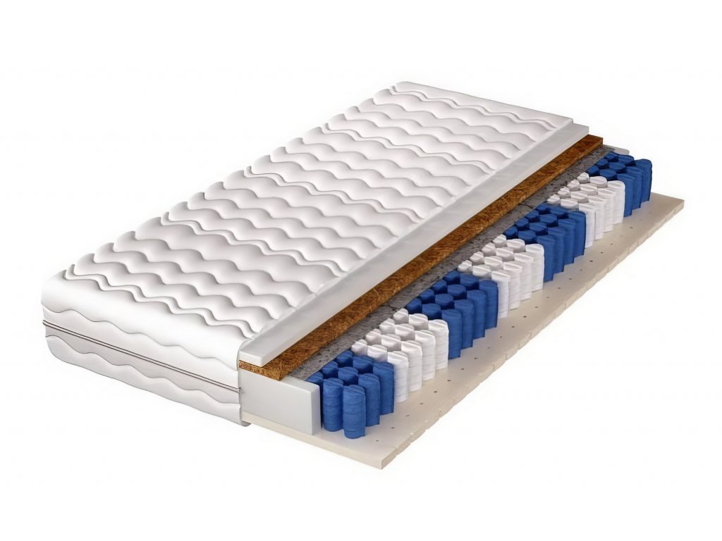 Pružinová matrace 80x200 cm v pratelném snímatelném potahu. Jádro matrace je charakteristické hustě uspořádanými taštičkovými pružinami v množství 262 ks/m2 a 7 zónami tvrdosti, které zajišťují dokonalou oporu těla a komfort odpočinku. Za zmínku stojí funkce taštičkových pružin, které pracují odděleně a reagují jen v místě tlaku. Pokud si tedy na matraci lehnete, dojde ke stlačení pouze těch pružin, na které se vyvíjí tlak. Matrace je z jedné strany potažena 1 cm silnou kokosovou deskou a PUR pěnou T25 o síle 2 cm a z druhé strany 3 cm vrstvou latexu, což umožňuje výběr užitkové strany vzhledem k rozdílům ve vlastnostech materiálů. - Kokos se v matracích používá ke zpevnění, zvýšení nosnosti a odolnosti, zároveň je antibakteriální a antialergický. Pomáhá odvádět vlhkost z matrace a udržuje uvnitř suché prostředí. - Latex má skvělé ortopedické a fyziologické vlastnosti. Jeho antibakteriální vlastnosti zabraňují šíření bakterií, plísní a roztočů a také neabsorbuje prach. Doporučuje se tedy pro osoby s respiračními obtížemi. Matrace je hypoalergenní a použití bavlny v potahu matrace podporuje cirkulaci vzduchu a poskytuje dobrou tepelnou izolaci. Je odolná vůči různým druhům tlaku, deformaci a promáčknutí a poskytuje dobrou ventilaci, což ocení lidé s nadměrným pocením. Matrace má označení tvrdosti H3/H5 - středně tvrdá/extra tvrdá. Výška matrace je +/- 20 cm. Barva pěn se může lišit od vyobrazení.Doplňkové parametry