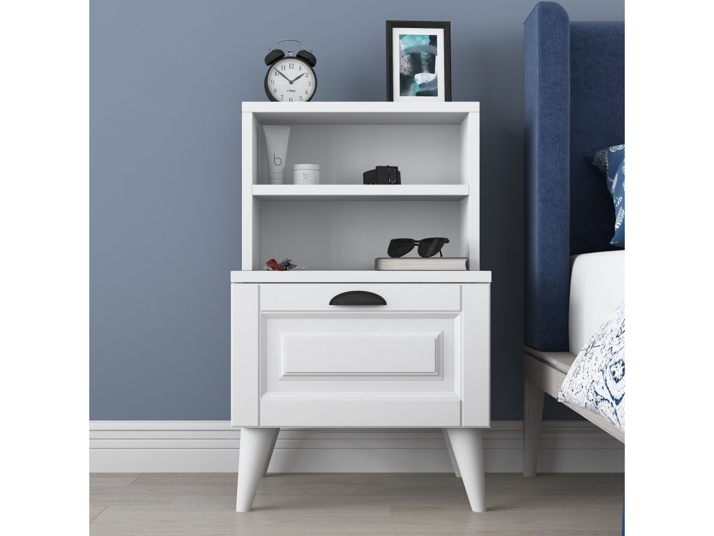 Noční stolek je stylový a praktický doplněk, který přináší do vaší ložnice čistý skandinávský design. V provedení s bílým povrchem a membránovými MDF dvířky je tento stolek nejen estetický, ale také funkční.