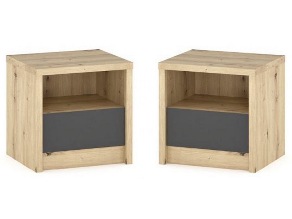 Noční stolek sada 2 ks z ložnicové řady. Barevné provedení dub artisan/šedý je zajímavé zachováním struktury dřeva. Bezúchytový systém podtrhuje jednoduchost, eleganci a moderní styl této řady. Nabídka komponentů této sektorové řady umožňuje sestavit si nábytek do ložnice dle vlastních představ. Dodáváme v demontovaném stavu.Doplňkové parametry