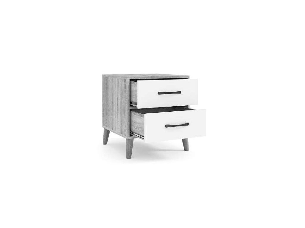 Noční stolek se dvěma zásuvkami, korpus je vyroben z LTD desky odolné vůči poškrábání v barvě antracit, čela zásuvek jsou vyrobeny z desky MDF v barvě dub wotan. Zásuvky jsou vybaveny teleskopickými výsuvy. Úchyty a nožky jsou v barvě antracit. Dodáváme v demontovaném stavu.Doplňkové parametry