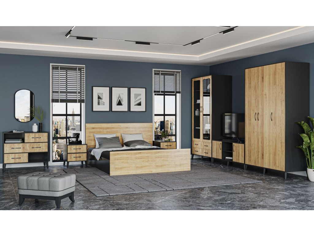 Sestava do ložnice je vyrobena z kvalitní LTD desky tl. 16 mm v barvě antracit, čela postele a zásuvek jsou vyrobeny z desky MDF v barvě dub wotan. Sestava se skládá z těchto...