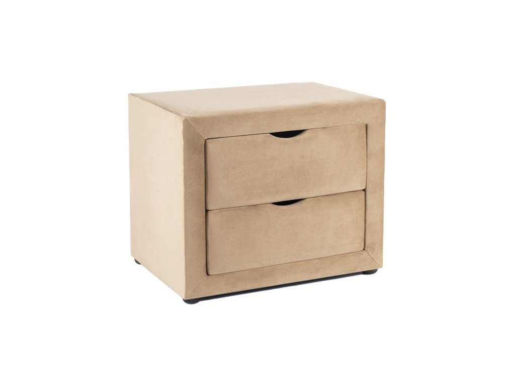 Elegantní čalouněný noční stolek se dvěma zásuvkami. Konstrukce je potažena látkou velvet (Bluvel 28) v béžové barvě. Nožky jsou vysoké 1.5 cm v černé barvě.Doplňkové parametry