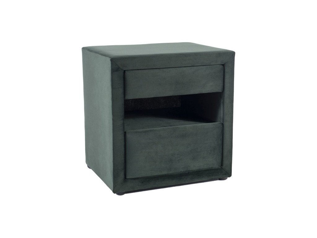 Elegantní čalouněný noční stolek se dvěma zásuvkami a poličkou. Konstrukce je potažena látkou velvet (Bluvel 78) v zelené barvě. Nožky jsou vysoké 1.5 cm v černé barvě.Doplňkové parametry