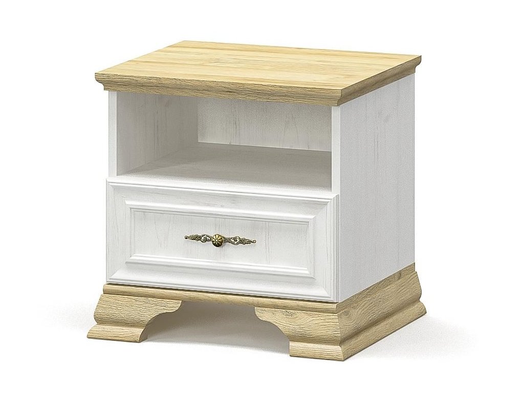Noční stolek se zásuvkou ze sektorové řady nábytku v romantickém stylu. Nábytek je vyroben z kvalitní LTD v kombinaci s MDF v barevné kombinaci borovice andersen/zlatý dub. V naší nabídce najdete další jednotlivé prvky tohoto nábytku, ze kterého si můžete zařídit obývací pokoj dle vlastních potřeb. Dodáváme v demontovaném stavu.Doplňkové parametry