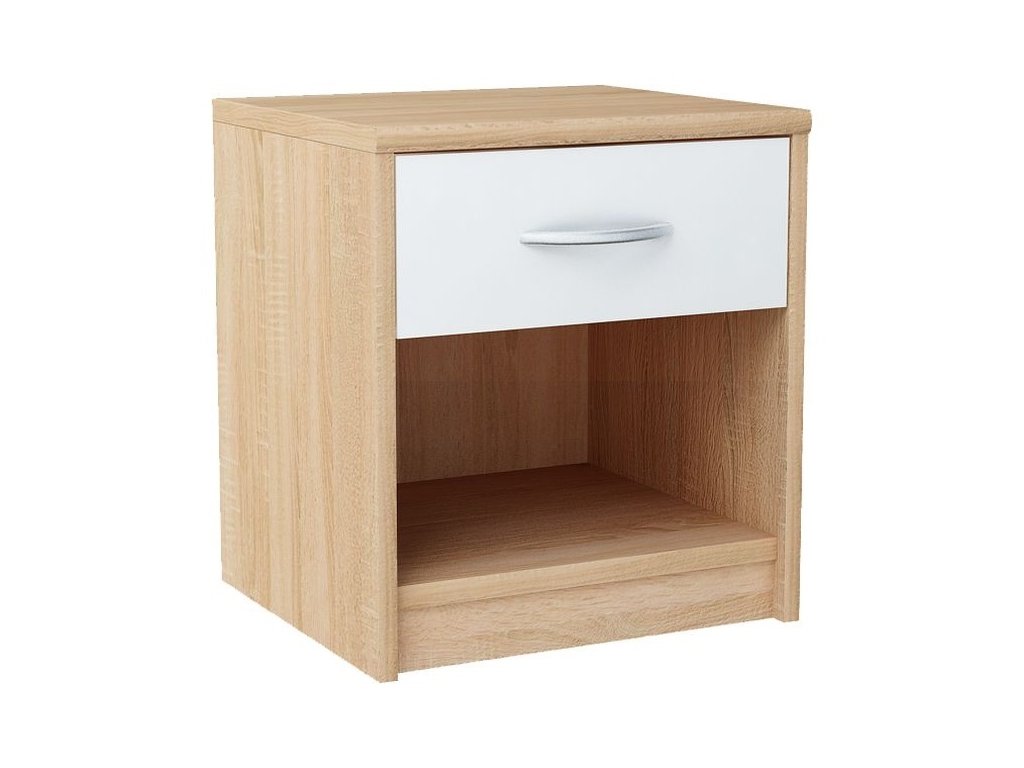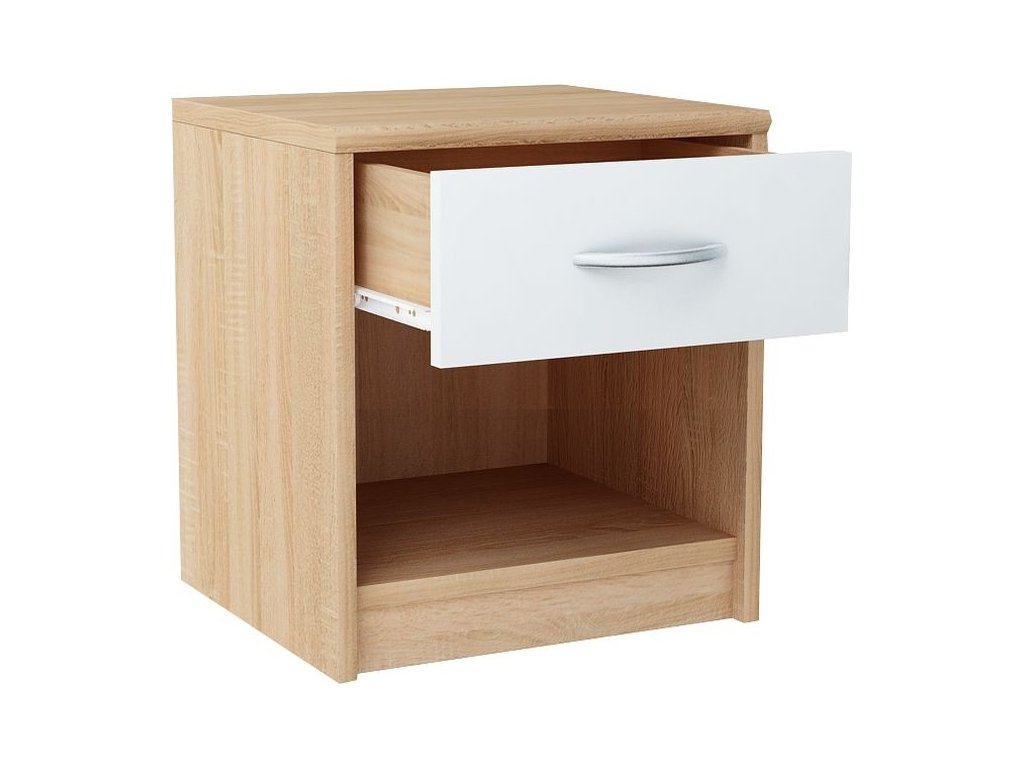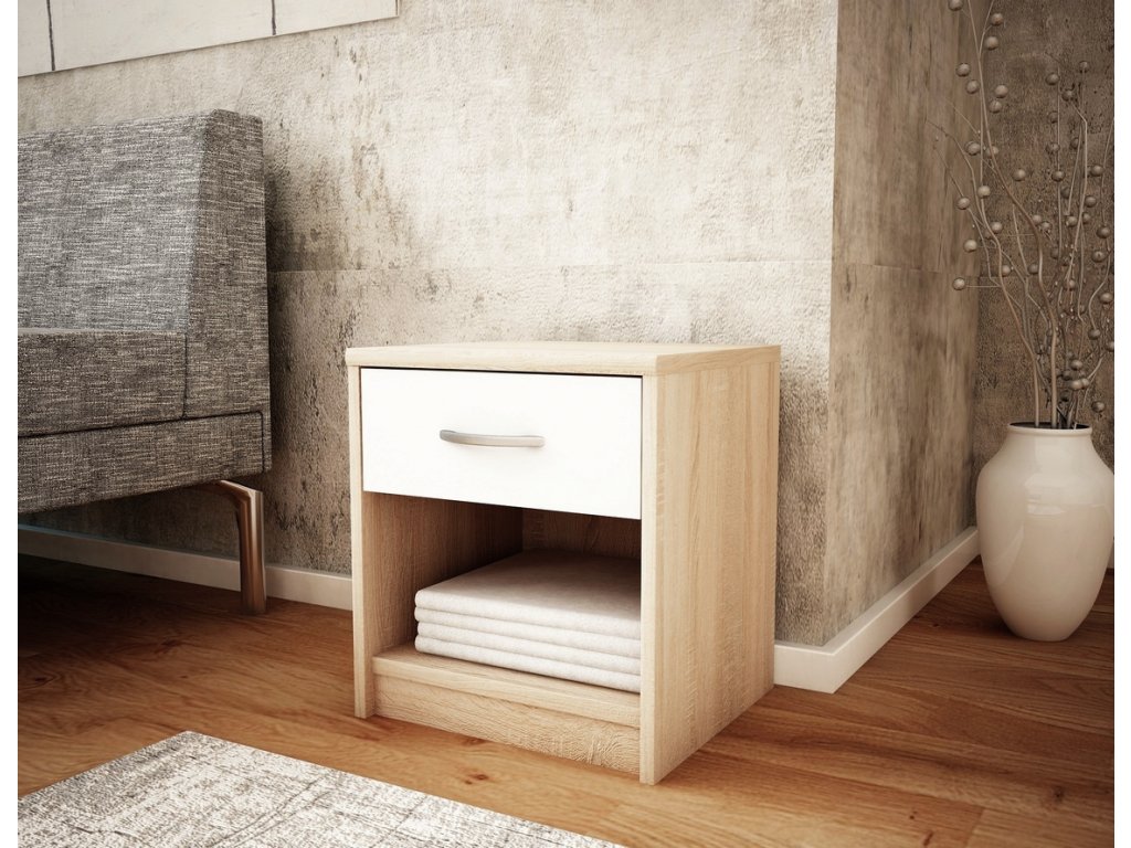 Noční stolek stolek v moderním provedení. Korpus i dvířka jsou z kvalitní LTD v barvě dub sonoma, dvířka pak bílé matné barvy. Lamino je odolné vůči vysokým teplotám, poškrábání a nárazům, hraněné ABS páskou. Stolek obsahuje 1 praktickou zásuvku. Jasně viditelná struktura dřeva. Dodáváme v demontovaném stavu.Doplňkové parametry