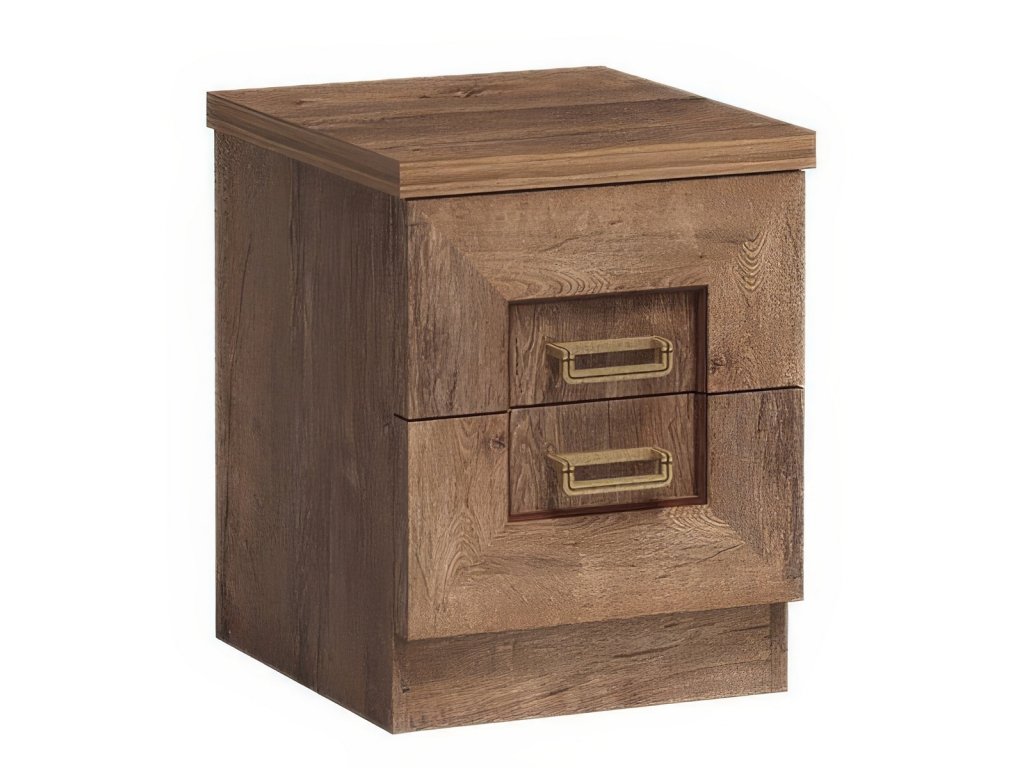 Noční stolek ze sektorové řady. Stolek má 2 praktické zásuvky. Systém je exkluzivní kolekce navržena v duchu vintage. Celá řada se vyznačuje elegancí a jednoduchými tvary, které zaručují plné využití prostoru. Nábytek je vyroben z velmi kvalitní LTD o tloušťce 16 mm, horní deska zesílena na 32 mm, lišty na čele nábytku jsou MDF, hrany ABS. Tvrzené sklo ve vitrínách je jemně zdobené. Elegantní úchyty jsou z kovu. Barevné provedení dub lefkas. Dodáváme v demontovaném stavu.Doplňkové parametry