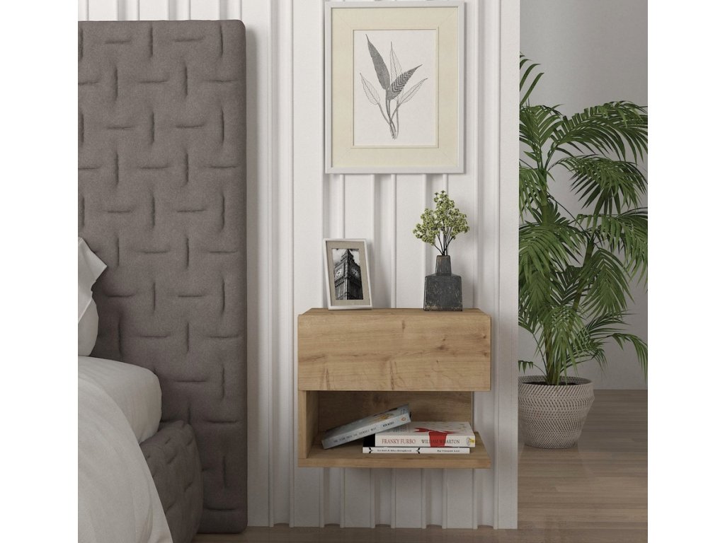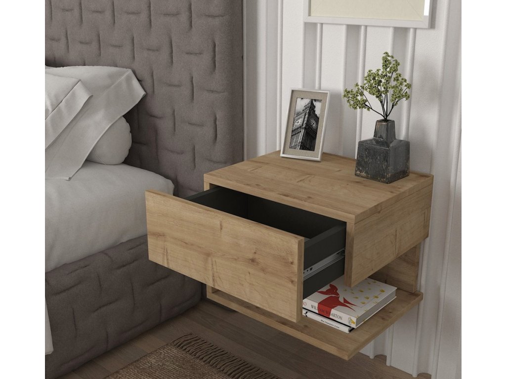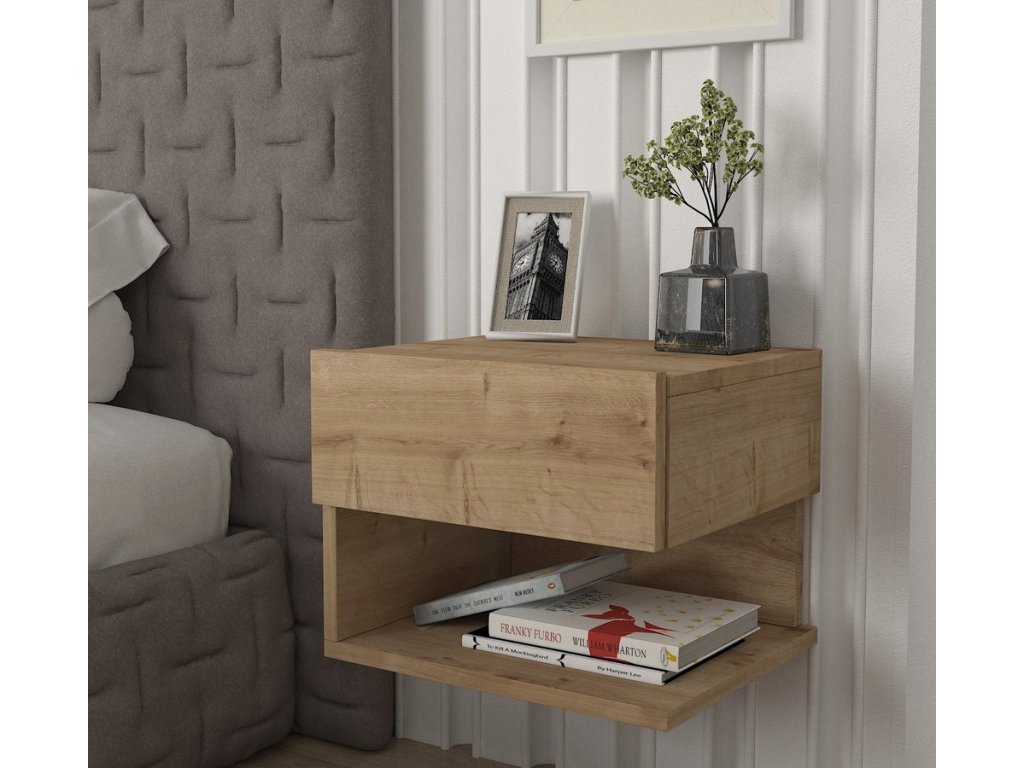 Závěsný noční stolek se zásuvkou a policí je vyroben z kvalitního lamina o tl.18 mm hraněné PVC páskou, odolného proti poškrábání v kombinaci barev sapphire/antracit. Dodáváme v demontovaném stavu.Doplňkové parametry