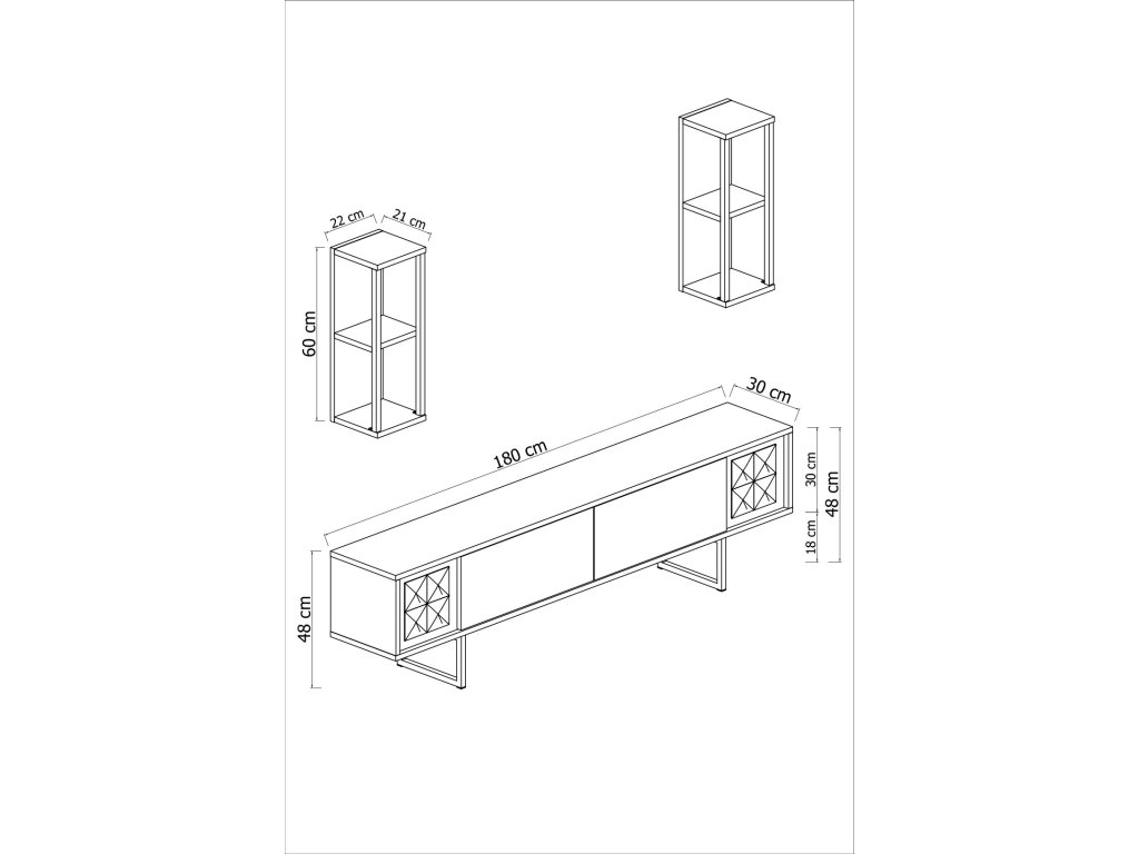 - Rozměry TV stolku: Šířka: 180 cm, Hloubka: 30 cm, Výška: 48 cm