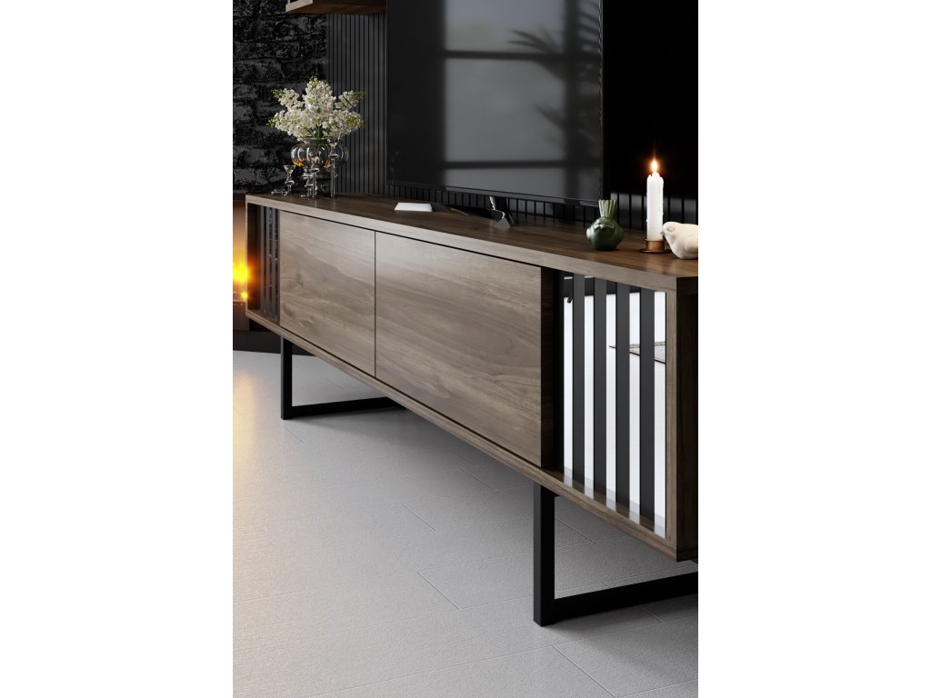 Tato skříňka s prostorným televizním stolkem o šířce 180 cm, hloubce 30 cm a výšce 48 cm poskytuje dostatek prostoru pro umístění vaší televize a dalších mediálních zařízení. Kovové nohy nejen dodávají moderní nádech, ale také zajišťují stabilitu a odolnost.