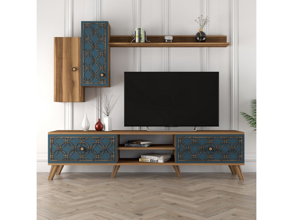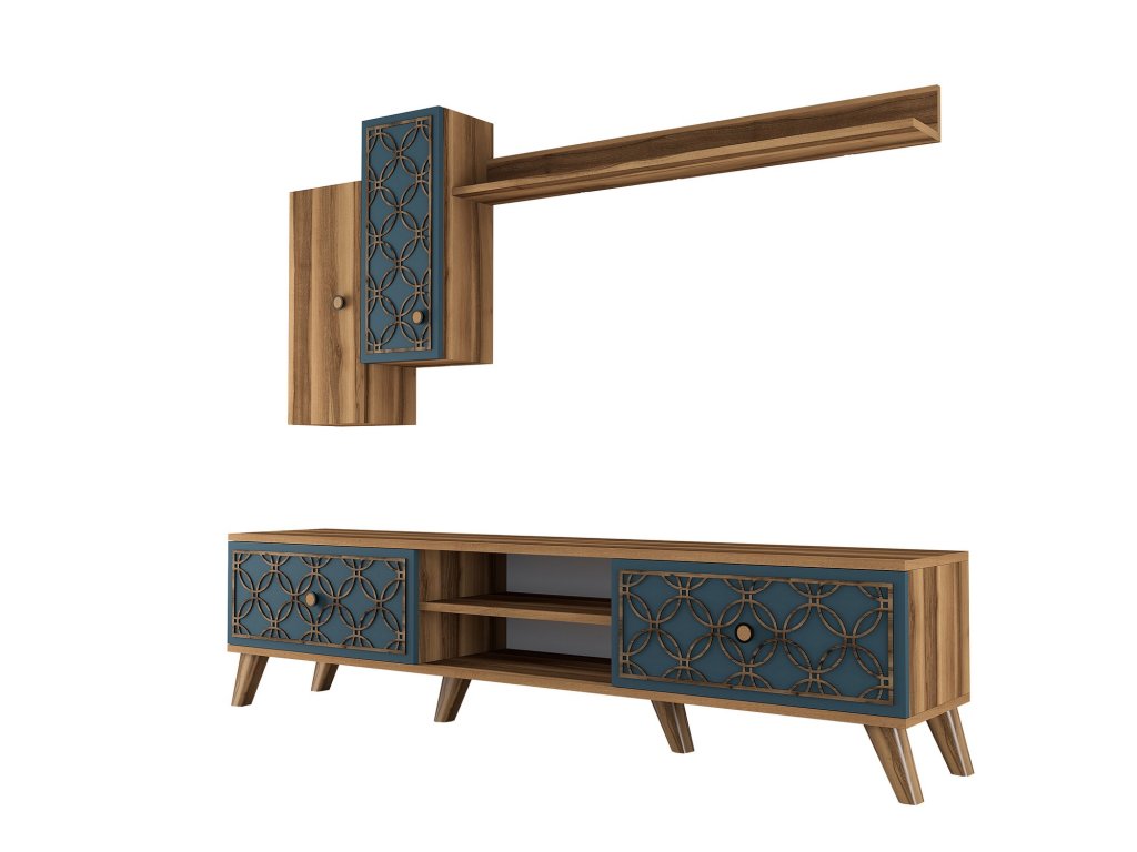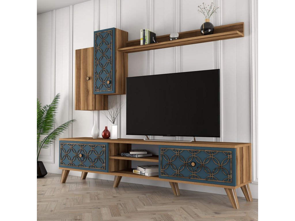 S šířkou 180 cm a výškou 44 cm je tato televizní skříňka perfektním ústředním bodem vaší zábavní zóny. Součástí dodávky je nástěnná police a skříňky, které nabízejí dostatek úložného prostoru pro všechny vaše mediální nezbytnosti, zatímco moderní design s barvami ořechu a chalcedonu dodá každé místnosti nádech elegance.