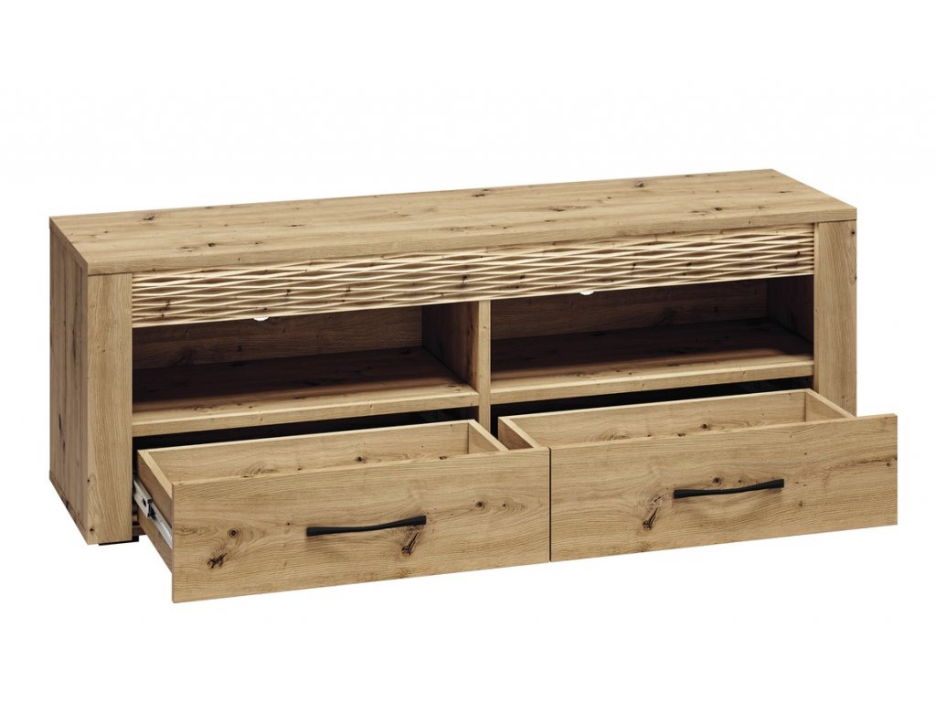 šířka: 150 cm | výška: 52 cm | hloubka: 40 cm Televizní stolek je vyroben z kvalitní desky LTD hraněné ABS páskou v barvě dub artisan. Dekorační riflovaná lišta nahoře z MDF...