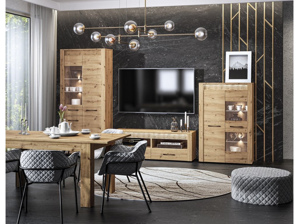 Sestava do obývacího pokoje je vyrobena z kvalitní desky LTD hraněné ABS páskou v barvě dub artisan. Sestava se skládá z těchto položek (Š x V x H cm) - vitrína třídveřová (92 x 200 x 40 cm), vitrína dvoudveřová nízká s osvětlením (92 x 140 x 40 cm) a televizní stolek s osvětlením (150 x 52 x 40 cm). Dvířka jsou vybaveny systémem tichého dovírání a je možné je namontovat na pravou nebo levou stranu. Úchyty jsou kovové černé. Možnost dokoupení LED osvětlení k vitrínám. Dodáváme v demontovaném stavu.Doplňkové parametry