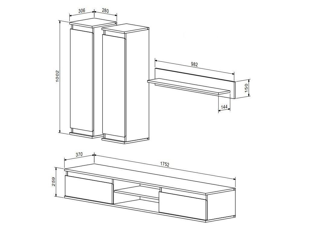 Obývací stěna se vyznačuje stylovým designem a moderní barevné provedení ozdobí váš obývací pokoj. Sestava se skládá - televizní stolek- výška/šířka/výška – 29/175/37 cm (dvoje výklopné dvířka), police - šířka - 99 cm a 2x závěsné skříňky - výška/šířka/výška – 100/30/28 cm (uvnitř dvě police). Barevné provedení - dub tahoe / bílá matná (Nymphea alba). Dodáváme v demontovaném stavu.Doplňkové parametry