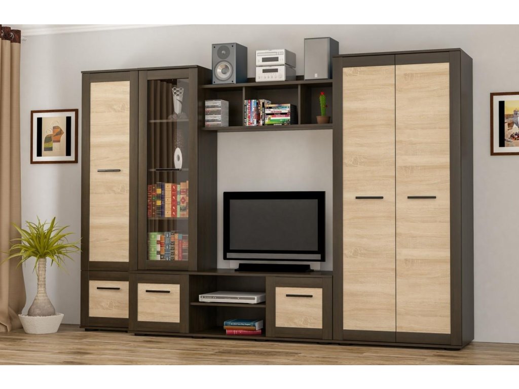 Sestava do obývacího pokoje v moderním provedení je vyrobena z kvalitní LTD desky v barevné kombinaci wenge/dub sonoma. Sestava se skládá z televizního stolku, nad kterým je umístěna police. Po obou stranách jsou vysoké skříně s policemi, kdy jedna z nich je prosklená a slouží jako vitrína. Úchyty jsou kovové. Dodáváme v demontovaném stavu.Doplňkové parametry