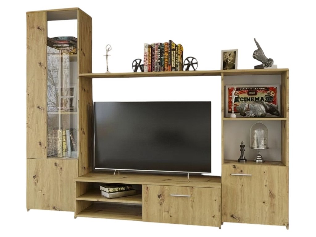 Obývací stěna v elegantním designu. Nábytek je v barevném provedení dub artisan. Nábytek je vyroben z kvalitního lamina vše hraněné ABS páskou. Lamino je odolné proti poškrábání, poškození, vlhkosti a vysokým teplotám. Sestava se skládá ( v/š/h ) - vitrína ( 179 x 50 x 31 cm ), tv stolek ( 30 x 120 x 41 cm ) a skříňka s policí ( 120 x 50-170 x 31 cm ). Nábytek dodáváme pouze jako sestavu v demontovaném stavu.Doplňkové parametry