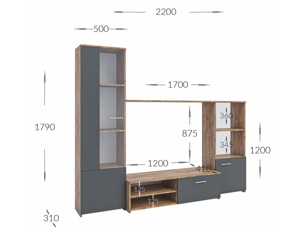 šířka: 220 cm | výška: 179 cm | hloubka: 41 cm Obývací stěna v elegantním designu. Nábytek je v barevném provedení bílá ma s šedým dubem kraftt. Nábytek je vyroben z kvalitního...