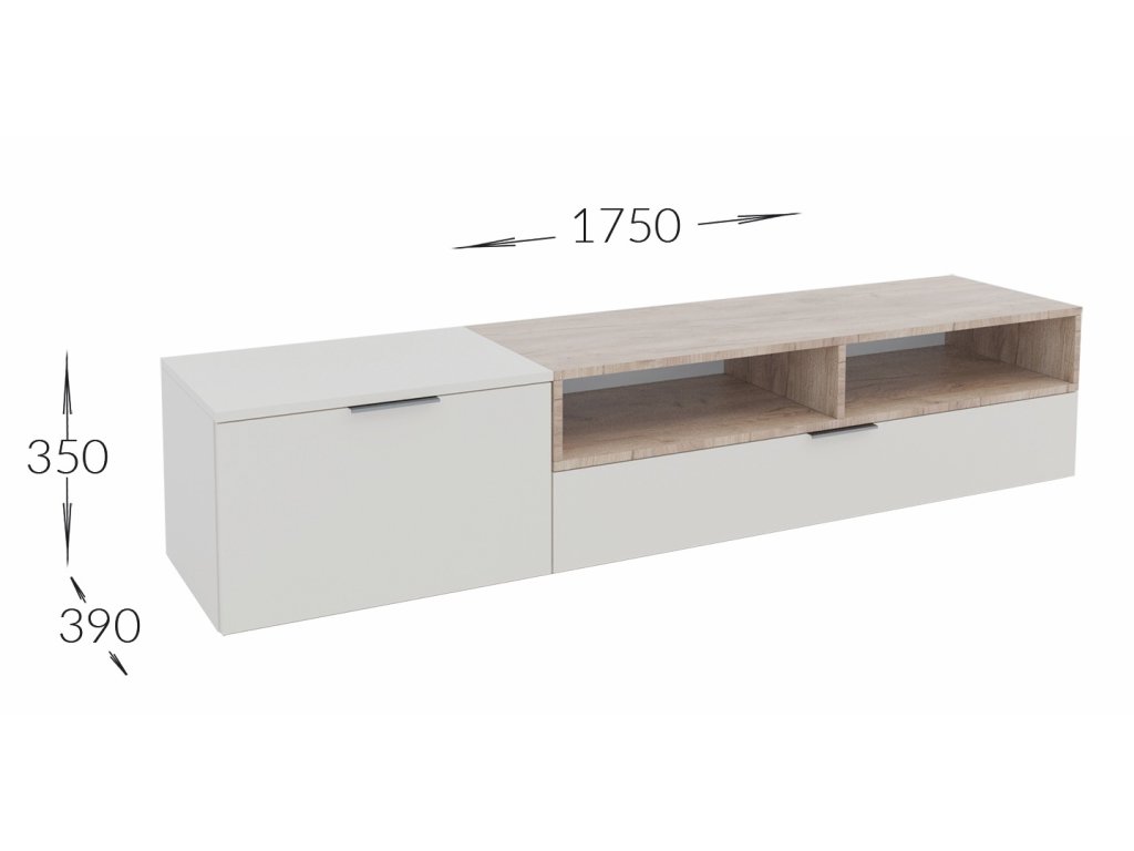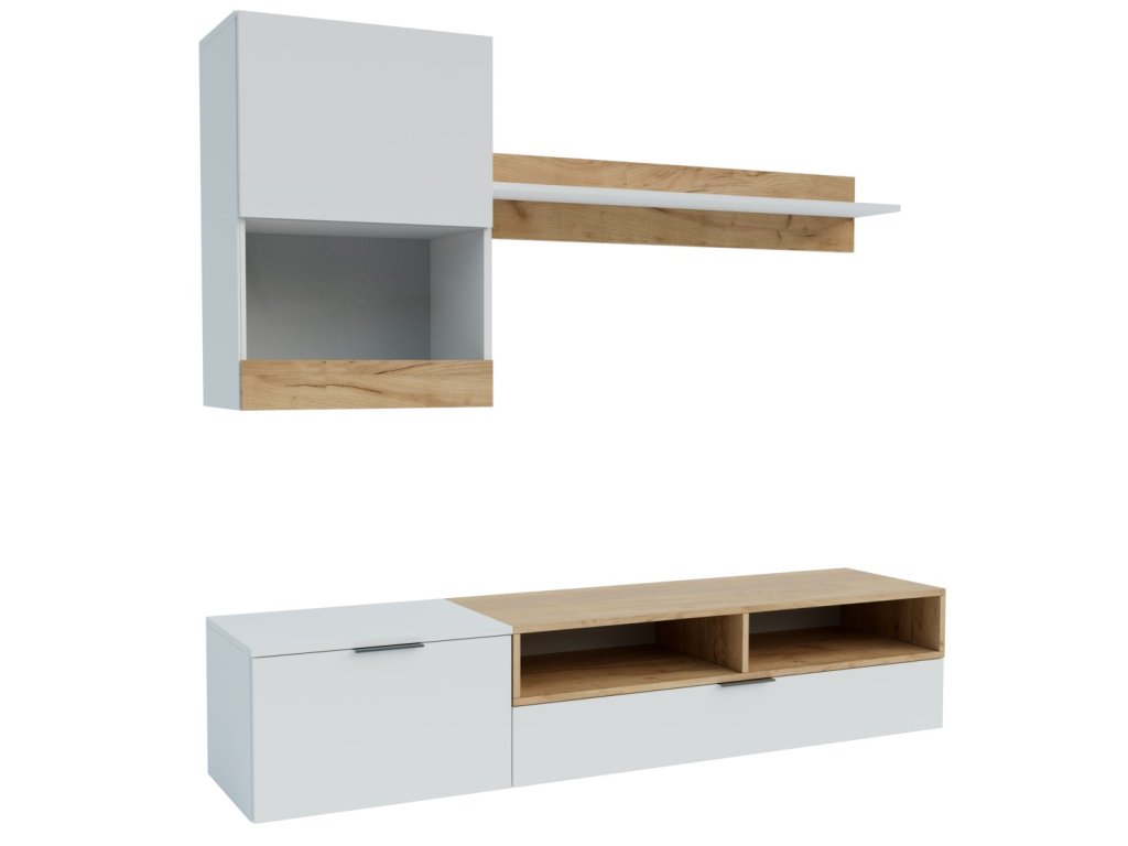 Moderní obývací stěna je navržena podle nejnovějších trendů. Je vyrobena z kvalitního lamina v barvě bílé mat, doplněna barvou dub kraft zlatý. Sestava se skládá ( šířka/výška/hloubka ) - TV stolek ( 175 x 34 x 39 cm ), závěsná skříňka ( 55 x 77 x 31 cm ) a police ( 120 x 20 x 20 cm ). Tato stěna se prodává jako sestava, jednotlivé díly nelze koupit zvlášť. Dodáváme v demontovaném stavu.