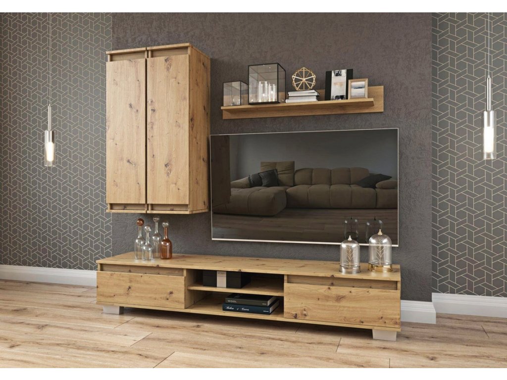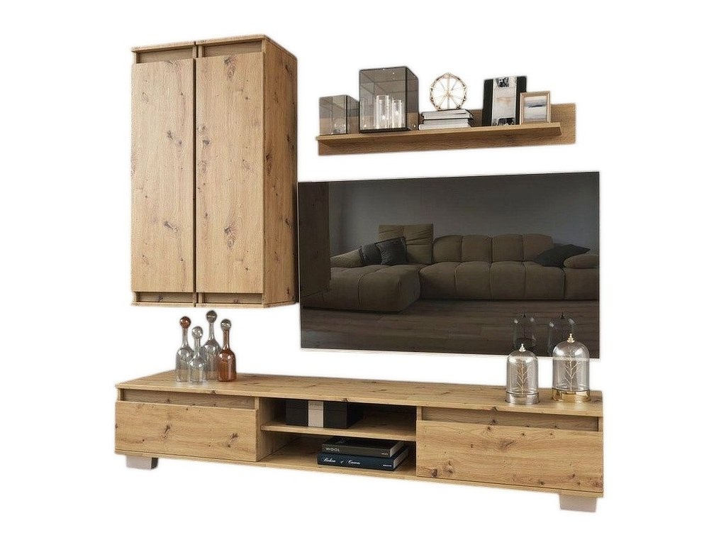 Levná obývací stěna v moderním barevném provedení dub artisan se stane výrazným prvkem každé místnosti. Nábytek je vyroben z kvalitního lamina hraněného melaninem. Sestava se skládá z ( šířka/hloubka/výška ) - televizní stolek se 2 zásuvkami ( 175,2 x 37 x 31 cm ), 2x závěsná skříňka 1-dveřová ( 28 x 30,6 x 100,2 cm ) a police ( 98,2 x 16 x 15 cm ). Tato stěna se prodává jako sestava, jednotlivé díly nelze koupit zvlášť. Dodáváme v demontovaném stavu.Doplňkové parametry