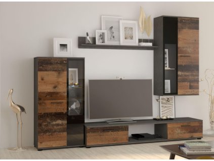 Moderní obývací stěna, která si zakládá na nejnovějších trendech bydlení. Nábytek je vyroben z kvalitního lamina. Sestava se skládá z ( šířka/hloubka/výška ) - TV stolek ( 120 x 40,3 x 31,5 cm ), vysoká vitrína ( 75 x 33,9 x 190 cm ), nízká vitrína ( 75 x 33,9 x 117 cm ) a police ( 140 x 17,6 x 16 cm ). Korpus je v barvě dub lefkas a dvířka jsou v barvě grafit. Tato stěna se prodává jako sestava, jednotlivé díly nelze koupit zvlášť. Ve vitrínách jsou skleněné police. LED osvětlení není v ceně, možnost dokoupení. Dodáváme v demontovaném stavu.Doplňkové parametry