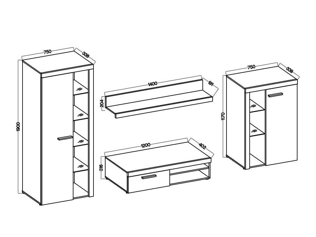 Moderní obývací stěna, která si zakládá na nejnovějších trendech bydlení. Nábytek je vyroben z kvalitního lamina. Sestava se skládá z ( šířka/hloubka/výška ) - TV stolek ( 120 x 40,3 x 31,5 cm ), vysoká vitrína ( 75 x 33,9 x 190 cm ), nízká vitrína ( 75 x 33,9 x 117 cm ) a police ( 140 x 17,6 x 16 cm ). Korpus je v barvě dub lefkas a dvířka jsou v barvě grafit. Tato stěna se prodává jako sestava, jednotlivé díly nelze koupit zvlášť. Ve vitrínách jsou skleněné police. LED osvětlení není v ceně, možnost dokoupení. Dodáváme v demontovaném stavu.Doplňkové parametry