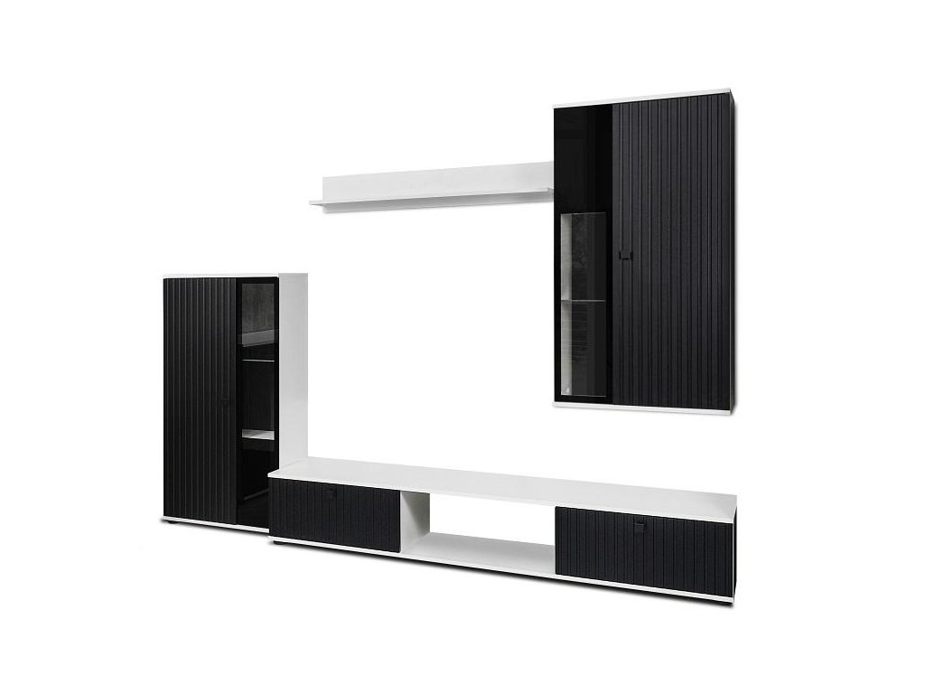 Moderní obývací stěna, která si zakládá na nejnovějších trendech bydlení. Nábytek je vyroben z kvalitní desky LTD v barevném provedení černá/bílá. Sestava se skládá ze dvou vitrín, televizního stolku a police a prodává se pouze jako sestava. Prostor pro televizi je - výška 91 cm, šířka 132 cm. Dodáváme v demontovaném stavu.Doplňkové parametry