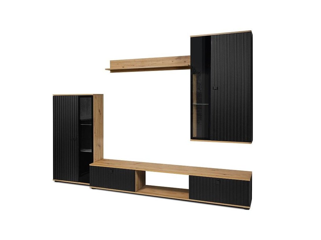 Moderní obývací stěna, která si zakládá na nejnovějších trendech bydlení. Nábytek je vyroben z kvalitní desky LTD v barevném provedení je černá/dub artisan. Sestava se skládá ze dvou vitrín, televizního stolku a police a prodává se pouze jako sestava. Prostor pro televizi je - výška 91 cm, šířka 132 cm. Dodáváme v demontovaném stavu.Doplňkové parametry