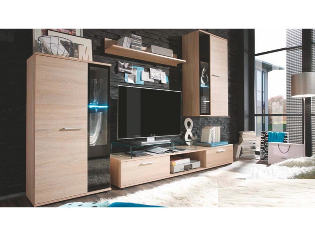 Moderní obývací stěna. Nábytek je vyroben z kvalitního lamina. Sestava se skládá z vitríny 59 x 31 x 115, TV stolku 176 x 40 x 28, závěsné vitríny 59 x 31 x 113 a police 102 x 18 x 16 cm. Obývací stěna je v barvě dub sonoma. Sklo ve vitríně je čiré. Tato stěna se prodává jako sestava, jednotlivé díly nelze koupit zvlášť. Možnost doobjednání komody nebo LED osvětlení. Dodáváme v demontovaném stavu.Doplňkové parametry