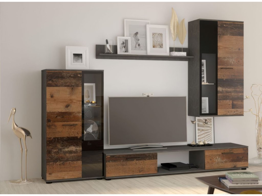 Moderní obývací stěna. Nábytek je vyroben z kvalitního lamina. Sestava se skládá z vitríny 59 x 31 x 115, TV stolku 176 x 40 x 28, závěsné vitríny 59 x 31 x 113 a police 102 x 18 x 16 cm. Korpus je v barvě dub old style, dvířka v barvě matera (černošedá). Sklo ve vitríně je čiré. Tato stěna se prodává jako sestava, jednotlivé díly nelze koupit zvlášť. Možnost doobjednání komody nebo LED osvětlení. Dodáváme v demontovaném stavu.Doplňkové parametry