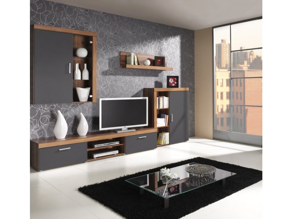 V ceně sestavy je TV stolek, závěsná vitrína, police a skříňka.