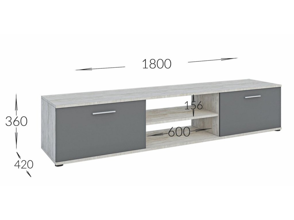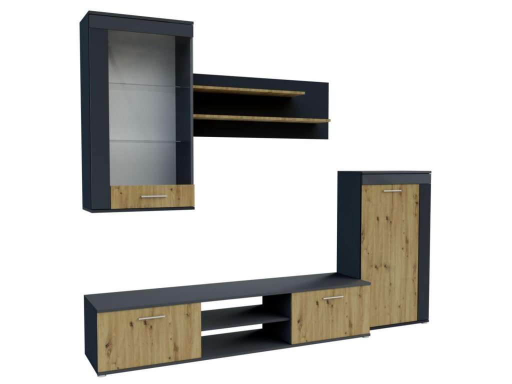 Moderní obývací stěna vhodná i do menších bytů. Tato sestava je vyrobena z kvalitního lamina. Sestava se skládá ( šířka/výška/hloubka ) - TV stolek ( 180 x 36 x 42 cm ), vitrína ( 60 x 109 x 30,5 cm ), komoda ( 60 x 111 x 30,5 cm ) a police ( 110 x 40 x 20 cm ). Korpus a část předních dvířek je barvy antracit, dvířka jsou doplněna o barvu dub artisan. Tato stěna se prodává jako sestava, jednotlivé díly nelze koupit zvlášť. U vitríny je možnost dokoupení LED osvětlení. Dodáváme v demontovaném stavu.Doplňkové parametry