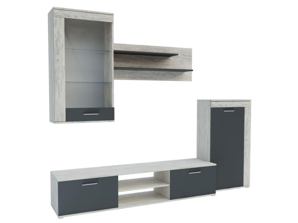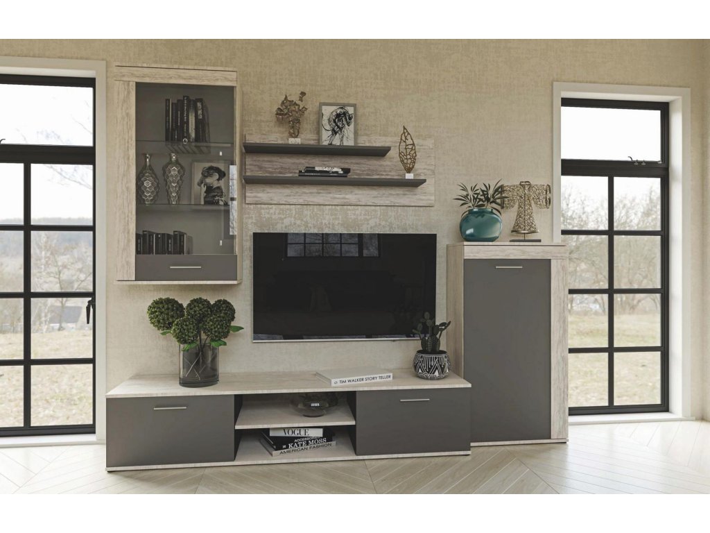 Moderní obývací stěna vhodná i do menších bytů. Tato sestava je vyrobena z kvalitního lamina. Sestava se skládá ( šířka/výška/hloubka ) - TV stolek ( 180 x 36 x 42 cm ), vitrína ( 60 x 109 x 30,5 cm ), komoda ( 60 x 111 x 30,5 cm ) a police ( 110 x 40 x 20 cm ). Korpus a část předních dvířek je barvy dub artwood, dvířka jsou doplněna o barvu grafit grey. Tato stěna se prodává jako sestava, jednotlivé díly nelze koupit zvlášť. U vitríny je možnost dokoupení LED osvětlení. Dodáváme v demontovaném stavu.Doplňkové parametry