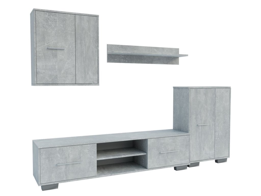Moderní obývací stěna vhodná i do menších bytů. Tato sestava je vyrobena z kvalitního lamina. Sestava se skládá ( šířka/výška/hloubka ) - TV stolek ( 160 x 39 x 38 cm ), nástěnná skříňka ( 60 x 67 x 22 cm ), komoda ( 60 x 89 x 30 cm ) a police ( 90 x 19 x 19 cm ). Korpus a přední dvířka jsou barvy světle šedá industriální. Tato stěna se prodává jako sestava, jednotlivé díly nelze koupit zvlášť. Dodáváme v demontovaném stavu.Doplňkové parametry
