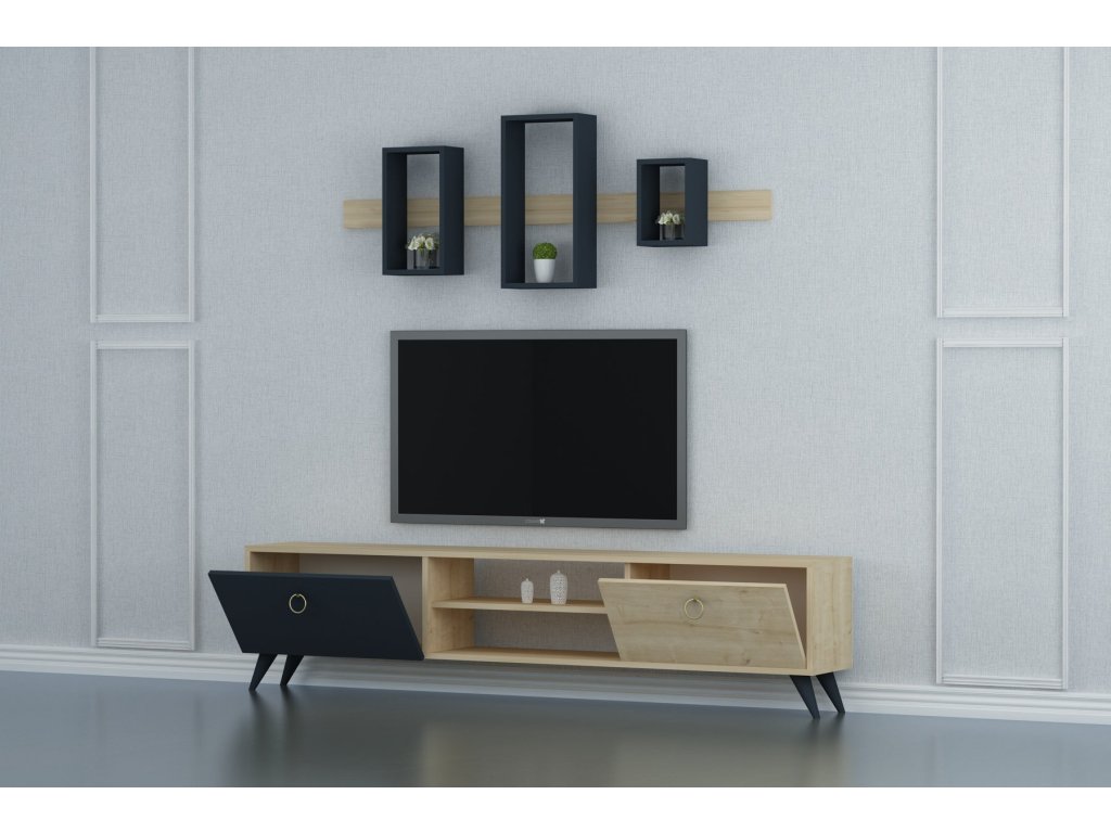 Sestava televizního stolku a závěsné police je vyrobena z laminátové desky v barevném provedení černá/dub artisan. Čela dvířek úložných prostor jsou z plastu. Rozměr televizního...