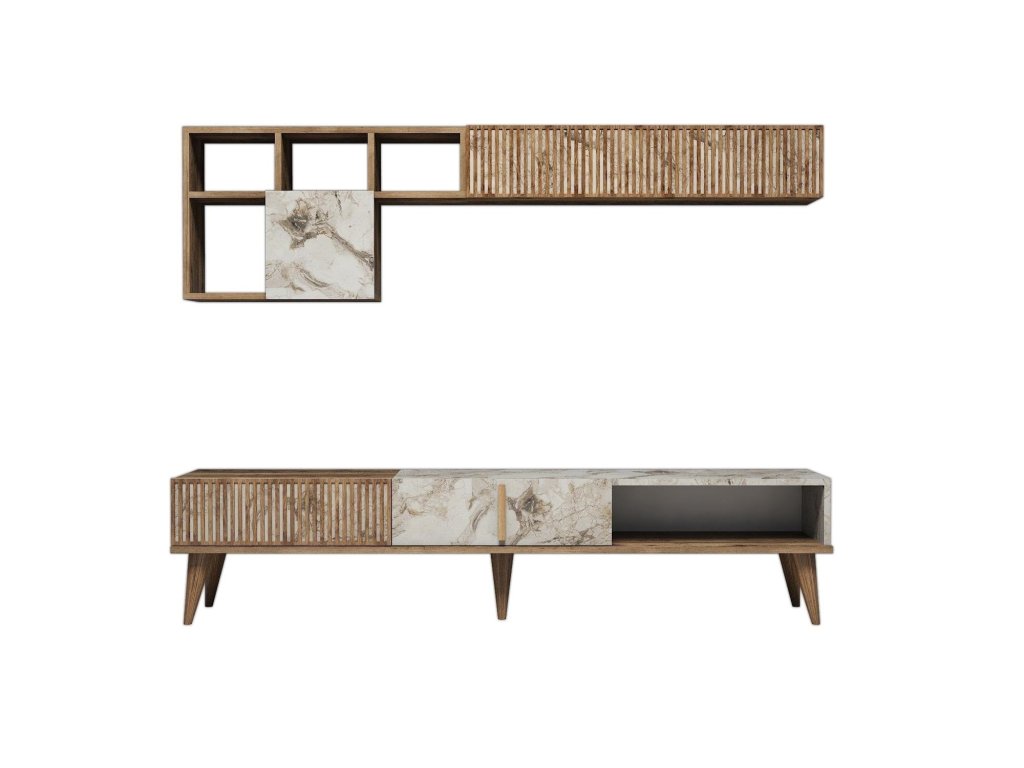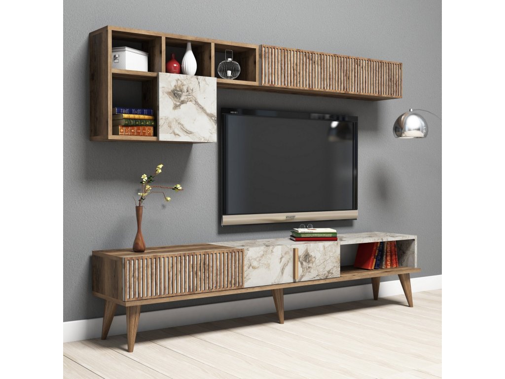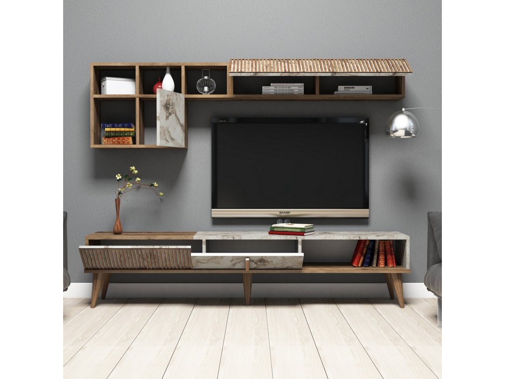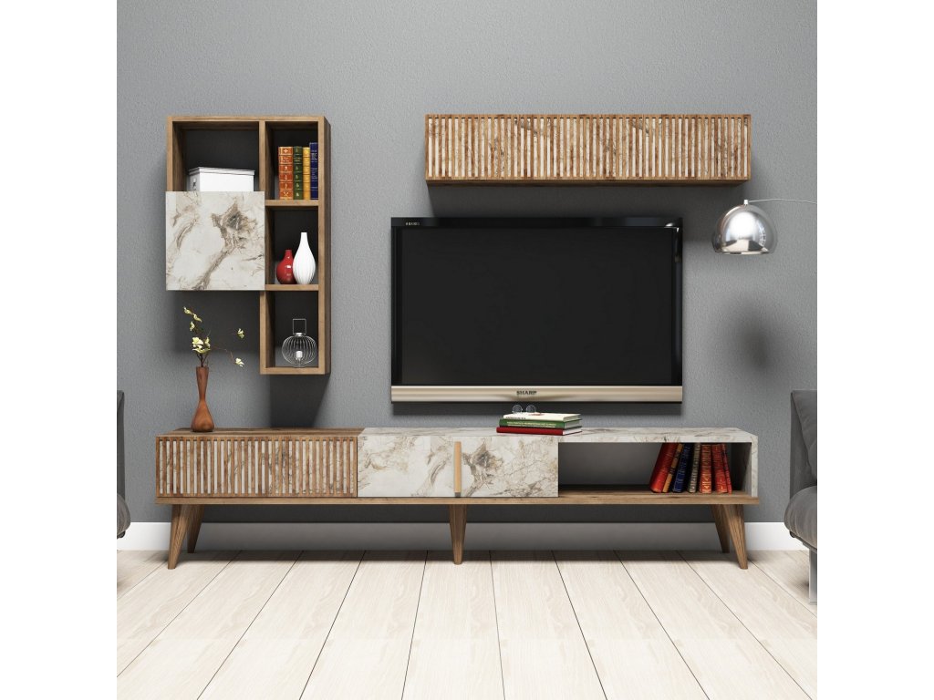 Stěna je navržena s ohledem na praktičnost a estetiku. Prostorný TV stolek nabízí dostatek místa pro televizor, multimediální zařízení a další příslušenství. Závěsná skříňka poskytuje úložný prostor pro knihy, dekorace nebo jiné předměty, které chcete mít elegantně uspořádané.