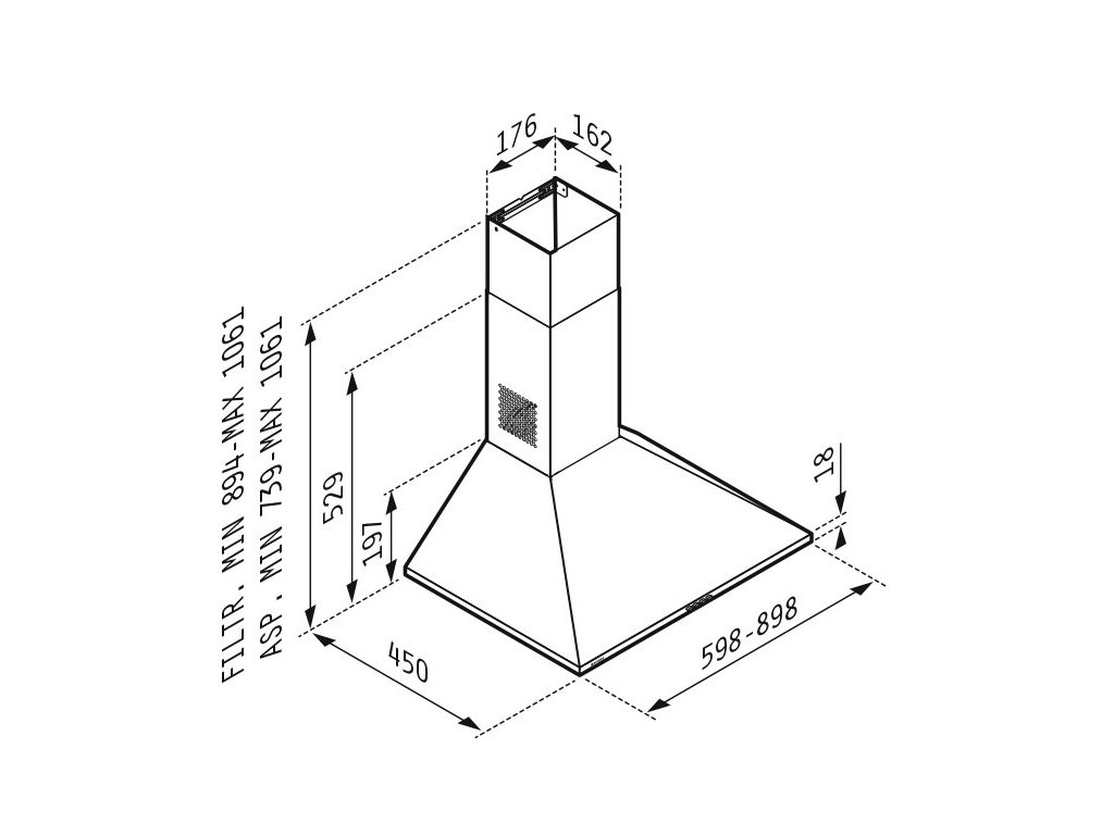 Komínový odsávač par Pyramis, barevné provedení - inox (nerez). Výkon odsávání - až 600m3/h, hlučnost 49 - 68 dB, motor 120 W. Rozměr (Š x H) 60 x 45 cm, další rozměry - viz. perokresba. Osvětlení LED. Energetická třída D.Doplňkové parametry