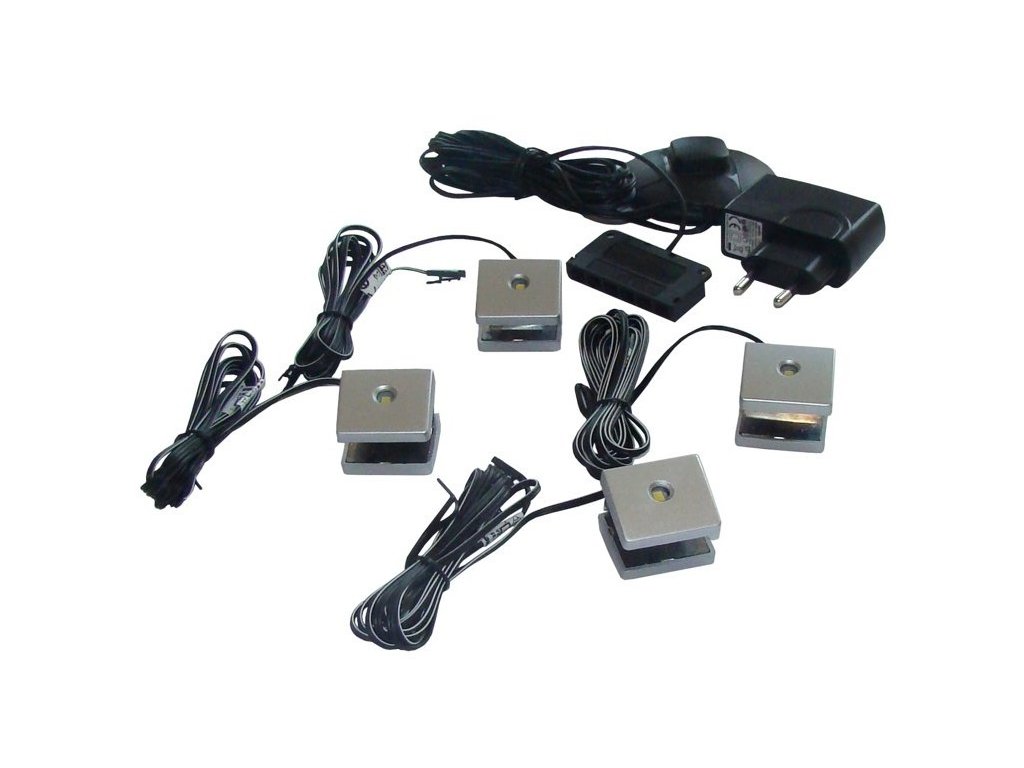 Osvětlení polic vitríny obsahuje: 4 x světelný bod (studené, bílé, LED), 1 x transformátor, dotykový spínač pro desku.Doplňkové parametry