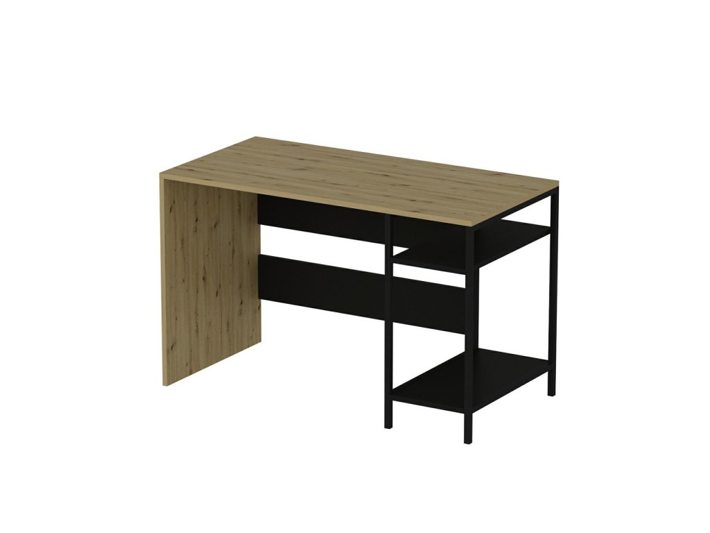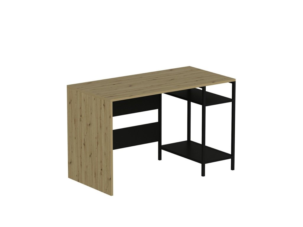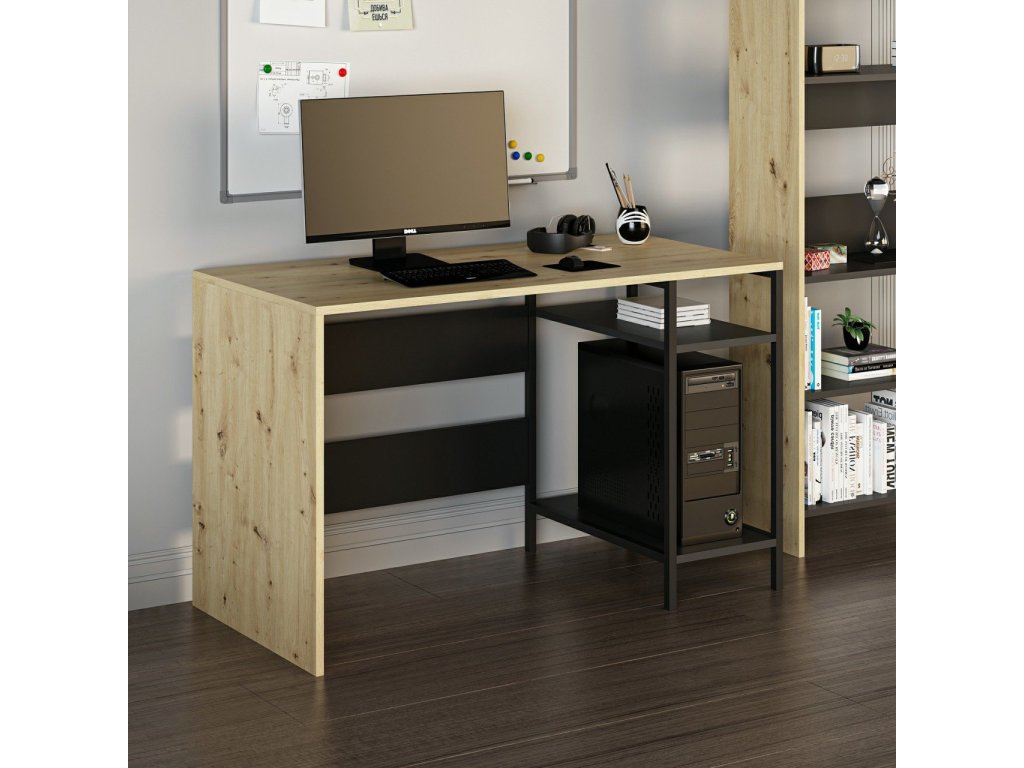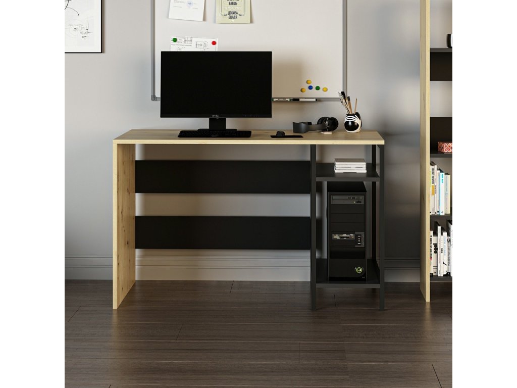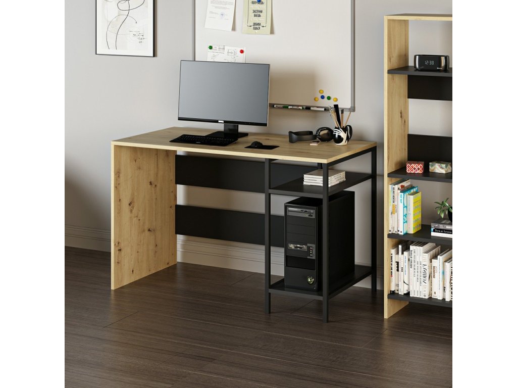 Psací stůl kombinuje moderní design s funkčností a je ideálním řešením pro dětský pokoj nebo pracovnu. Díky odkládacím policím a integrovanému kontejneru na PC poskytuje dostatek prostoru pro efektivní práci i studium. Jeho barevná kombinace dub Artisan a černá dodává interiéru elegantní vzhled.