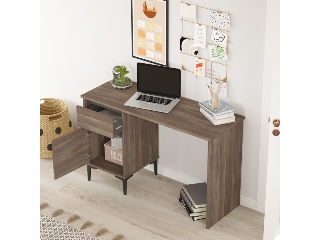 - Vybavení: Stůl obsahuje jednu zásuvku pro úložné potřeby a skříňku s plnými dvířky, která nabízí dodatečný úložný prostor.