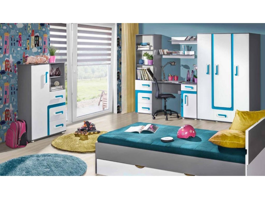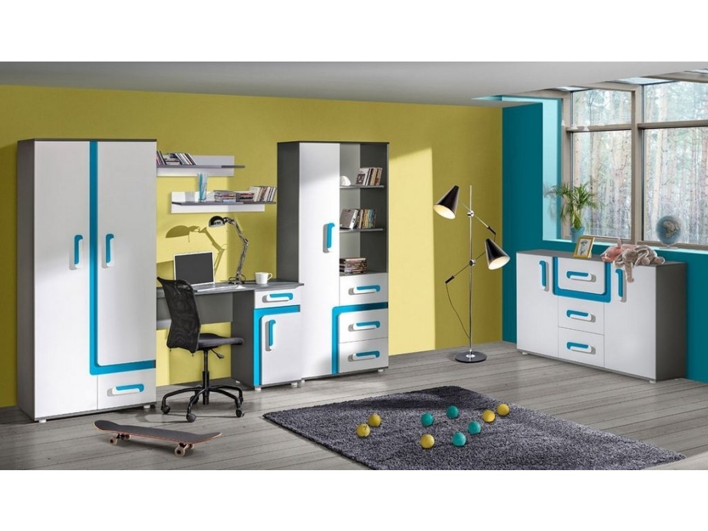 Pracovní stůl APETTITA ze sektorové řady, která se vyznačuje netradičním zpracováním barev a originalitou úchytů. Tento styl nábytku zaujme každou mladší generaci. Nábytek je vyroben z kvalitní LTD desky hraněné ABS lištou. Korpus je v barvě šedá antracit, dvířka a čela zásuvek jsou bílé matné, doplňková barva je tyrkys. Úchytky jsou v barevné kombinaci tyrkys/bílá. Sektorový nábytek APETTITA má široký výběr prvků, který Vám zaručí sestavit si dětský nebo studentský pokoj, ložnici či kancelář podle svých potřeb, přání a představ. Dodáváme v demontovaném stavu.Doplňkové parametry